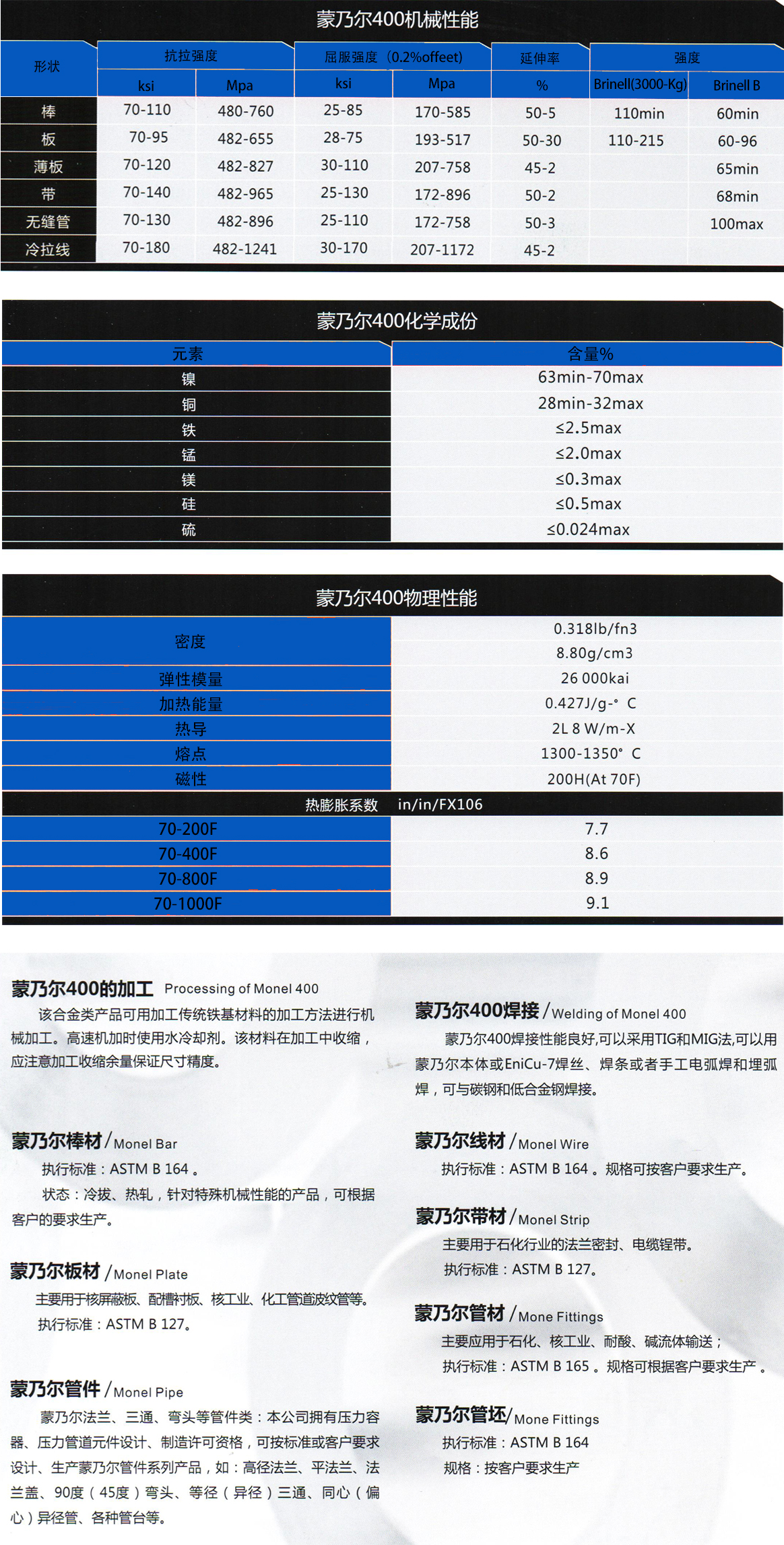 ASTM B127(板、帶),ASTM B165(無縫管)或按客戶要求。